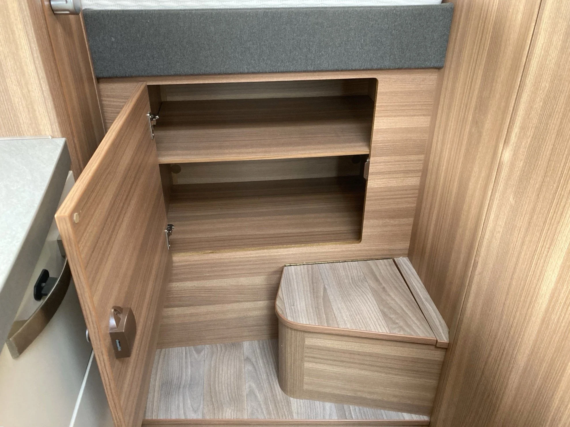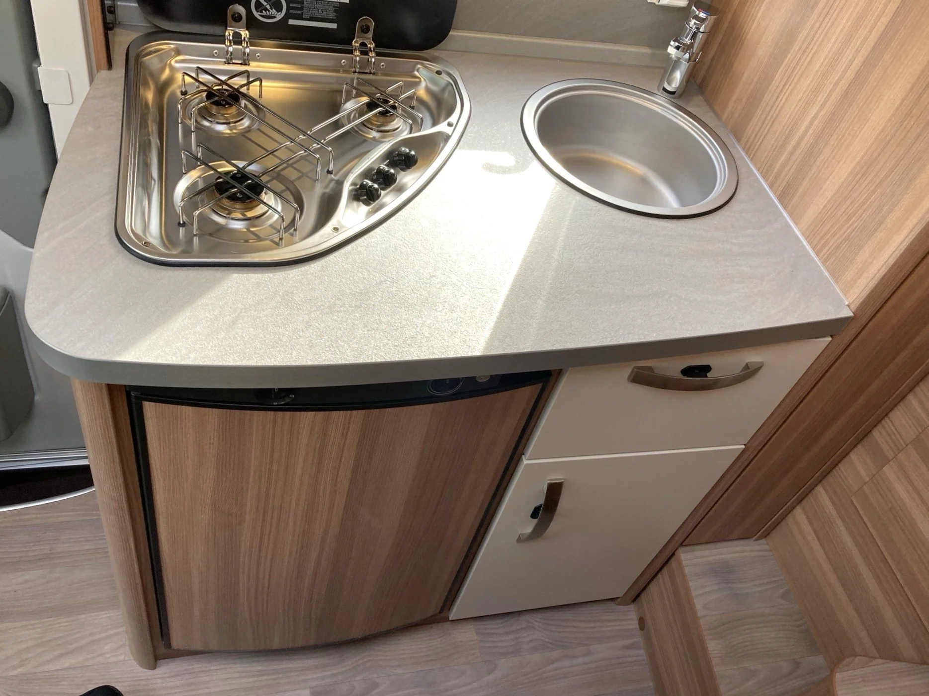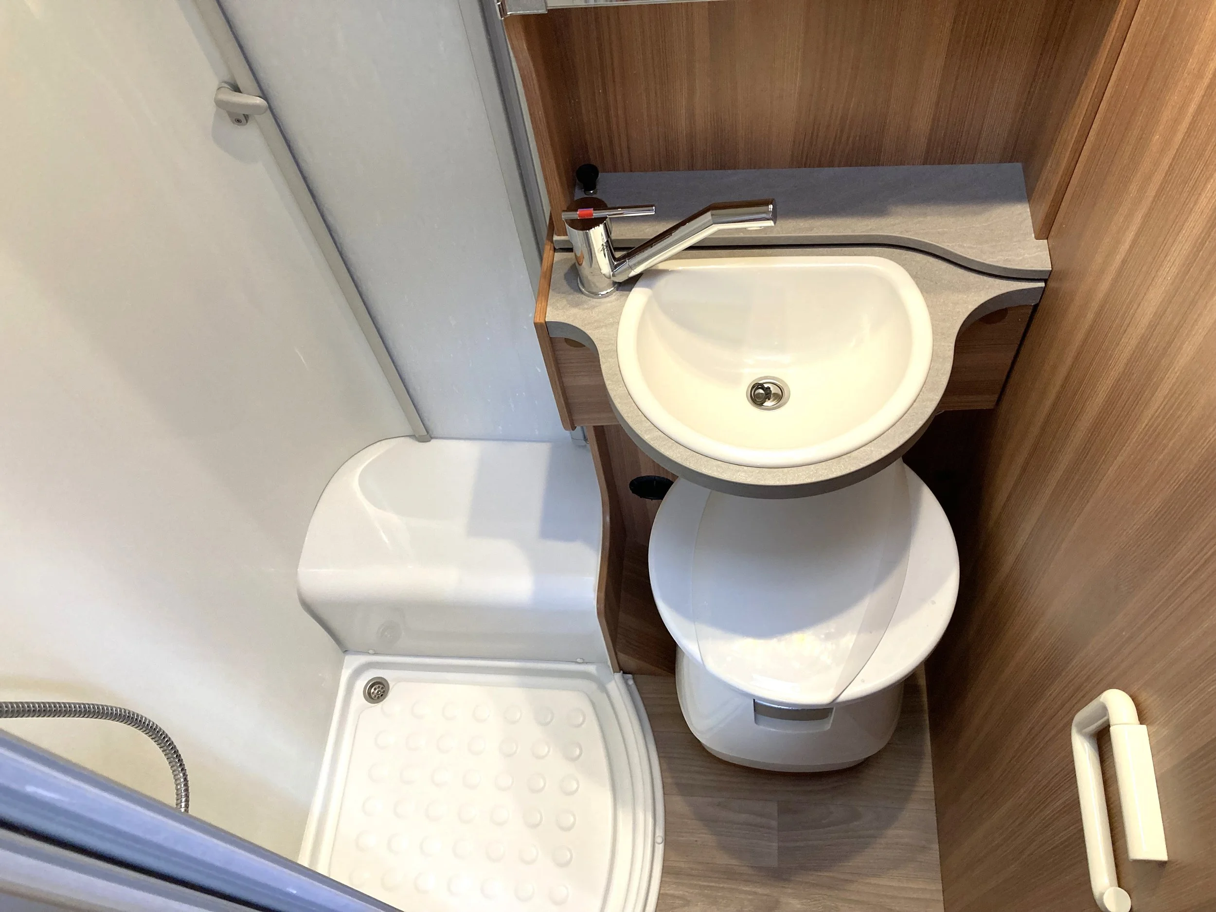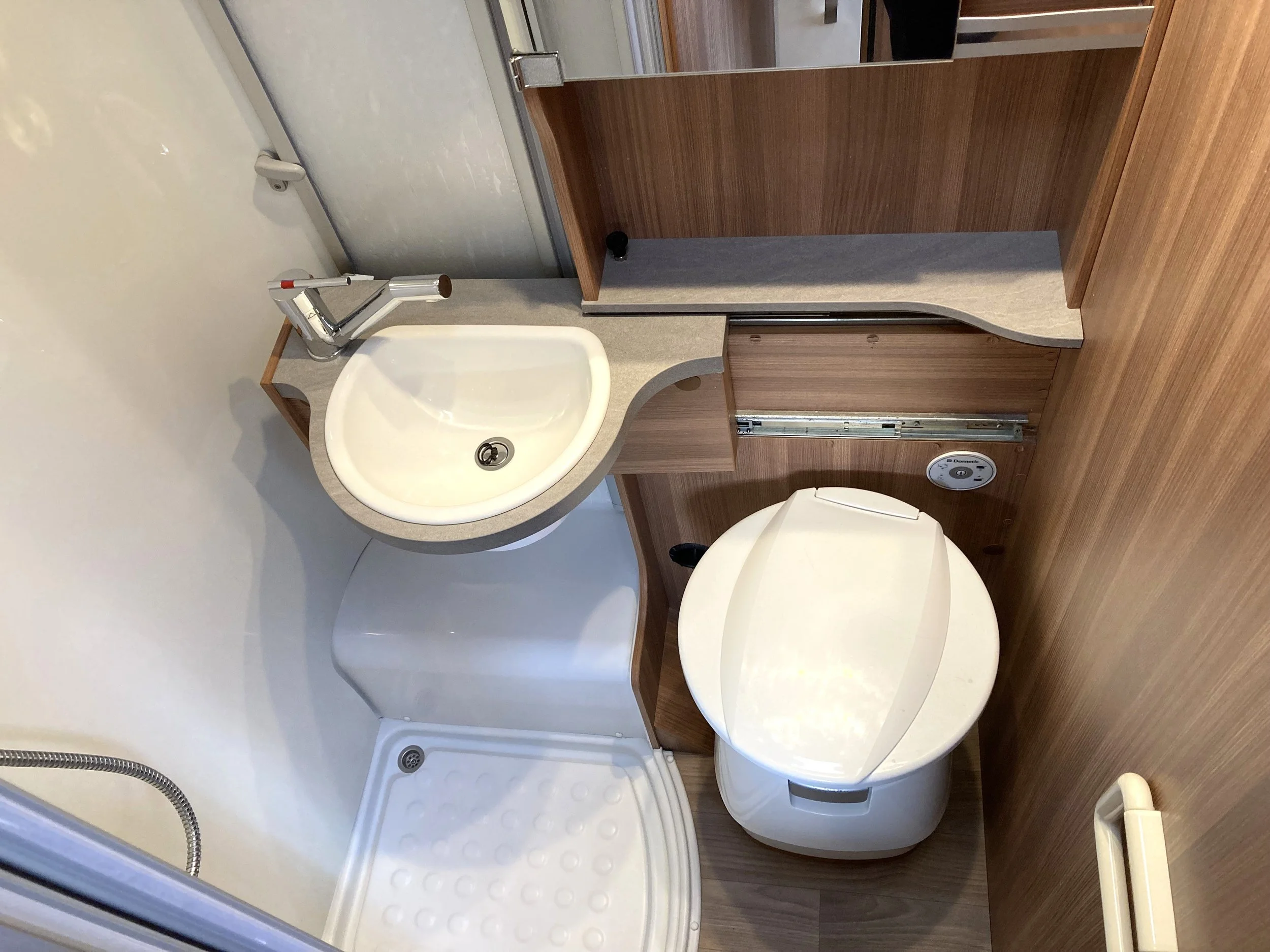 Inside, the 550MG features a practical layout with a fully equipped kitchen, including a fridge, combination cooker, and sink, making it easy to prepare meals. The lounge area is comfortable and versatile, where both captains chairs swivel to face. At the rear, the motorhome boasts a double bed, providing a restful night’s sleep after a day of exploration. The Caraloft 550MG is also equipped with a modern washroom with shower, toilet, and washbasin. Ample storage throughout ensures all your travel essentials are neatly stowed, while modern finishes give the interior a welcoming and homely feel.