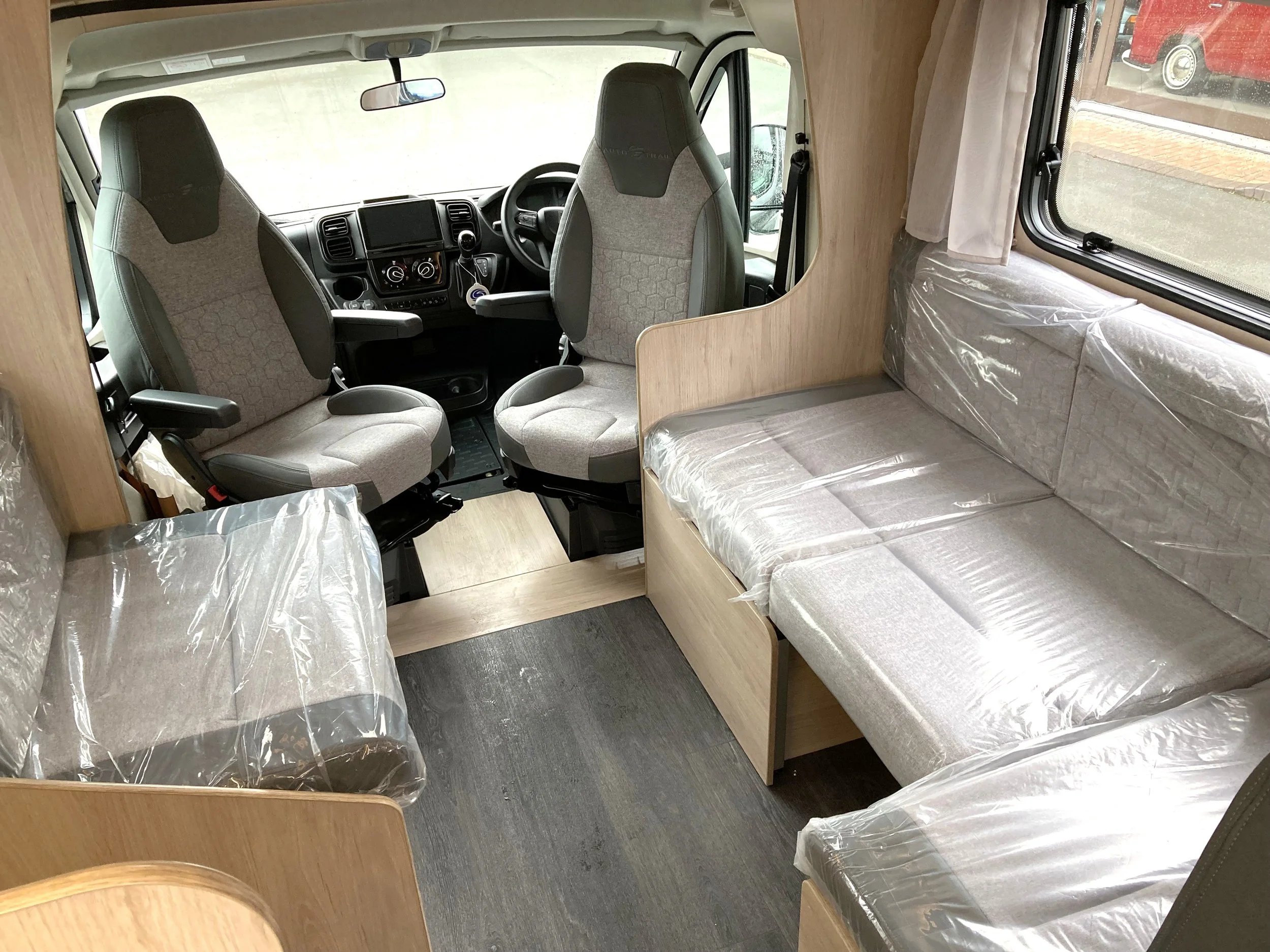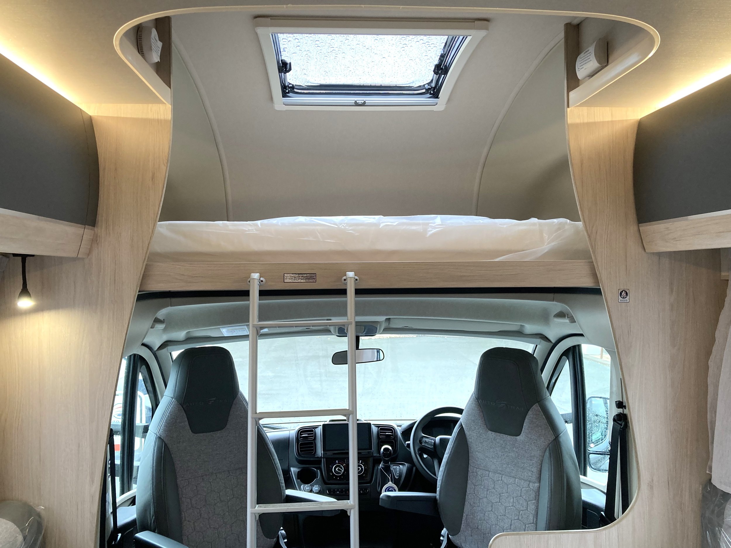 The C72 features a front living/dining area which can be converted into sleeping for 2. Above the cab is a double bed with is accessed by a ladder.