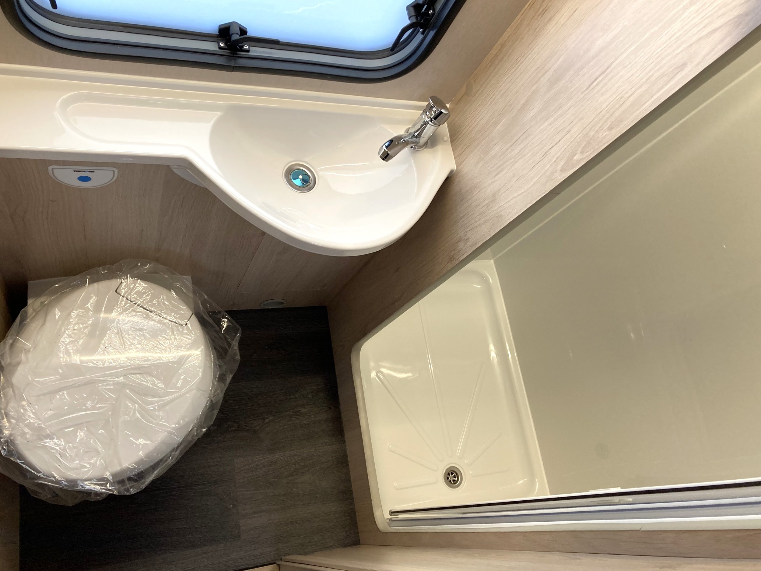 The central washroom provides a separate shower, sink/vanity unit and cassette toilet.
